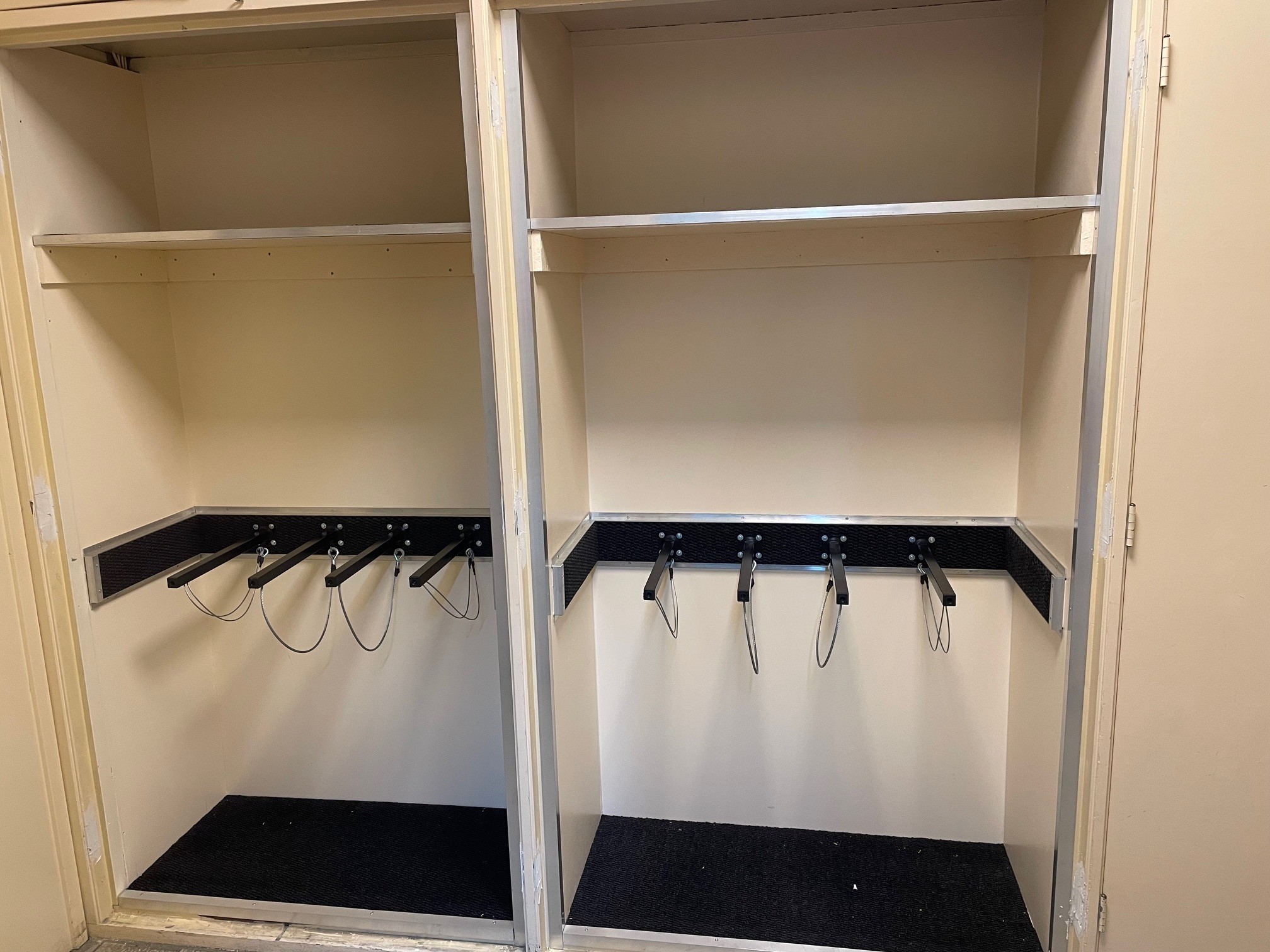 Naast de opbergruimte voor wapens en tassen in de ruimte tussen de kantine en de pistoolbaan is er nu nieuwe opbergruimte voor lange wapens in de ruimte tussen de kantine en de geweerbaan. Koffers, foudralen en tassen kunnen ook hier netjes opgeborgen worden wanneer je niet op de geweerbaan aan het schieten bent.