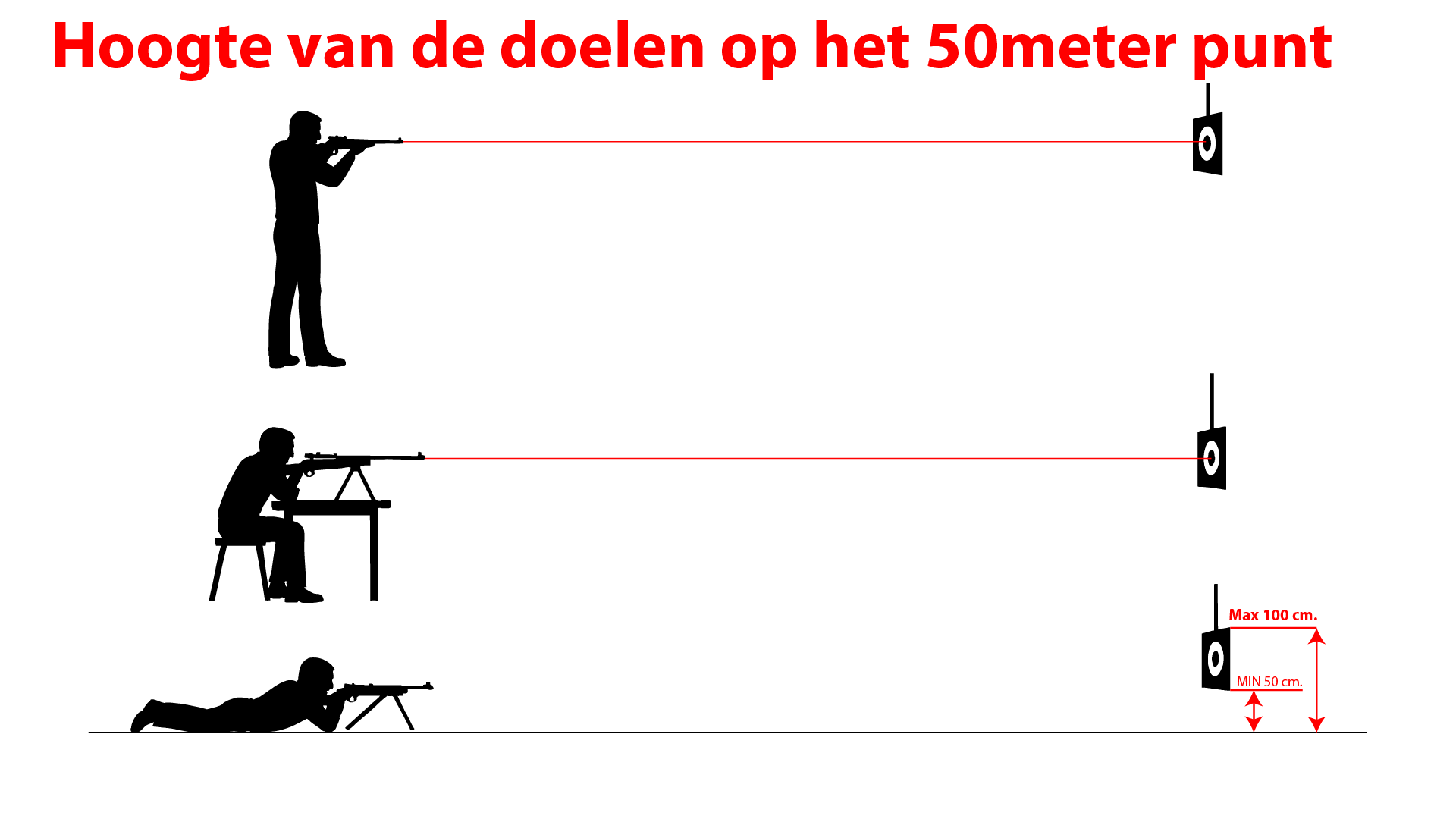 Hieronder zie je een afbeelding met daarop de hoogte waarop doelen op 50 meter moeten hangen. Houd je je hieraan dan blijft ons hout heel.